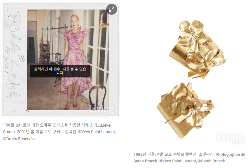이브 생로랑은 좋아하는 예술가들의 창작품을 정기적으로 연구했다. 앙리 마티스가 컷아웃 구아슈를 사용해 콜라주를 만든 것과 유사한 방식으로 이브 생로랑은 패치워크와 자수를 적용했으며, 옐로 오렌지빛 카네이션으로 장식된 드레스는 프루스트의 낭만주의를 기념한다. 또한 그가 죽어서도 사랑한, 비옥한 창작 세계에 일조한 모로코의 풍경이나 마조렐 정원Majorelle Garden에서 찾을 수 있는 부겐빌레아 꽃을 닮은 생동감 넘치는 색조도 채용했다. 프랑스 화가 피에르 보나르Pierre Bonnard가 그린 풍경에서 감명을 받아 오간자 앙상블에 추상적인 식물 프린트를 반영하기도 했다. 한편, 파리 박물관에서는 게스트 아티스트로 참여한 뉴욕 기반의 아티스트 샘 폴스Sam Falls의 작품을 공간 곳곳에서 마주하게 된다. 샘 폴스는 자연계에서 깨친 시간과 죽음의 덧없음에 관한 개념을 사진, 조각, 회화를 넘나드는 시각 매체를 통해 개성 있게 그려낸다. 전시는 샘 폴스의 작품과 이브 생로랑의 드레스가 교감하며 대화를 하는 듯 긴밀히 연출되었으며, 혁신적인 비전을 지닌 두 창작가가 시대와 세대를 초월해 보여주는 자연과의 연결이 임팩트를 남긴다. 향긋한 낭만과 실험정신이 충만한 전시는 마라케시 박물관에서 1월 5일까지, 파리 박물관에서는 오는 5월 4일까지 열린다.