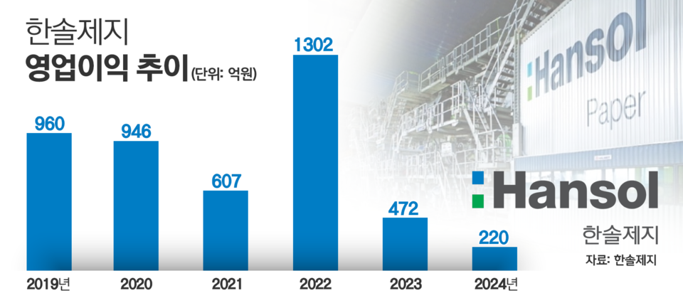 한솔제지의 지난해 매출은 2조2245억원, 영업이익은 220억원이다. 매출은 전년 대비 1.4% 늘었지만 영업이익은 53.5% 급감했다. 펄프 및 해상운임 급등에 더해 글로벌 제지 수요 약화, 환경 사업부문에서의 800억원 규모의 영업손실이 실적하락의 주원인이다.