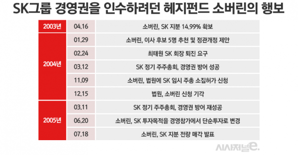 SK는 헤지펀드 소버린으로부터 경영권을 위협받았다. 소버린은 2003년 SK 지분 14.99%를 확보해 최태원 회장 등 경영진의 퇴진을 제안했다. SK의 경영권이 헤지펀드에 넘어갈 수 있던 위기의 순간이 발생한 것이다.