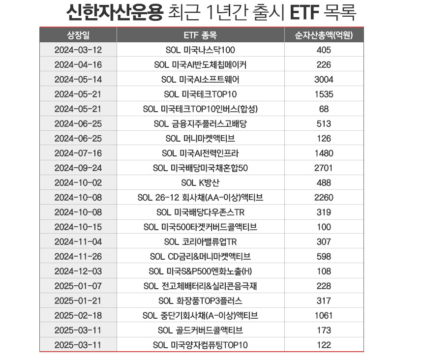 신한자산운용은 이어 지난달에는 SOL 골드커버드콜액티브 ETF를 출시하며 한국투자신탁운용이 ACE KRX금현물 ETF로 독점하고 있던 국내 금현물 ETF 시장구도를 깨뜨렸다. 동시에 SOL 미국양자컴퓨팅TOP10 ETF도 출시하면서 키움투자자산운용이 독점하고 있던 양자컴퓨팅 ETF 시장에도 뛰어들었다.