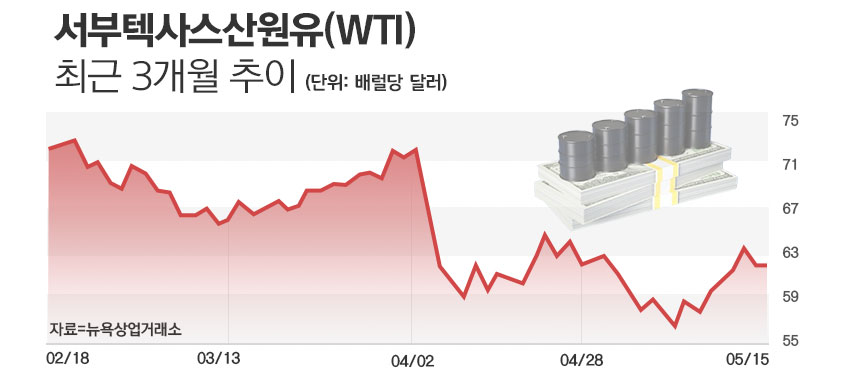15일 미국 뉴욕상업거래소에서 6월 인도분 서부텍사스산원유(WTI)는 배럴당 62.23달러에 거래를 마감했다. 3개월 전까지만 해도 70달러 안팎에서 머물던 WTI는 이달 5일 57.13달러까지 하락했다. 글로벌 원유 시장의 기준인 브렌트유도 마찬가지다. 같은날 브렌트유 가격은 66.09달러다.