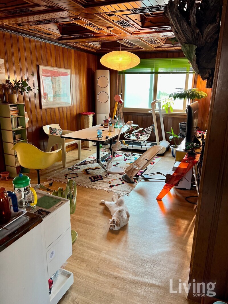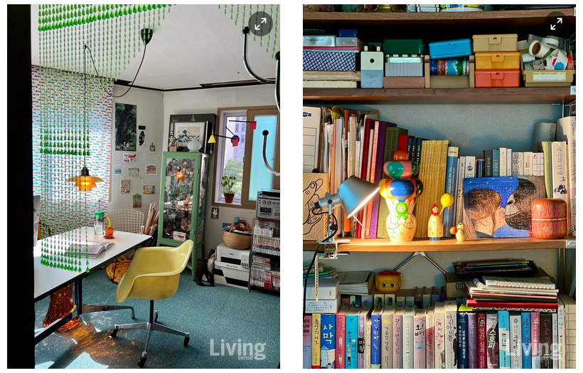 코로나19 팬데믹 시기 집을 이사하며 작업실을 정리하게 되었고, 개인 작업에 몰두할 수 있는 공간이 필요해 집 안에 홈 오피스를 마련했다. 나무 벽과 잘 어울리는 큰 다이닝 테이블을 거실 한가운데에 두고 작업대로 활용했으며, 자연스럽게 인테리어의 중심이 되었다. 공간 활용을 유연하게 하는 편이라 때로 테이블을 서재로 옮겨 사용하기도 한다. 서재는 답답하게 느껴지던 문을 떼어내고, 대신 구슬발을 달아 오픈된 구조로 변형했다. 나무 루바 벽과 어우러지도록 연노란색 임스 체어, 이케아의 파브리셰르 장식장, 전산시스템의 민트색 책장을 배치해 레트로한 무드를 완성했다.