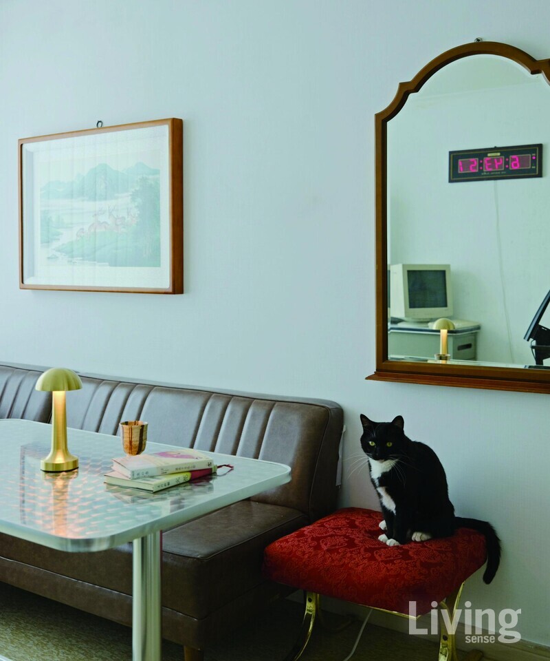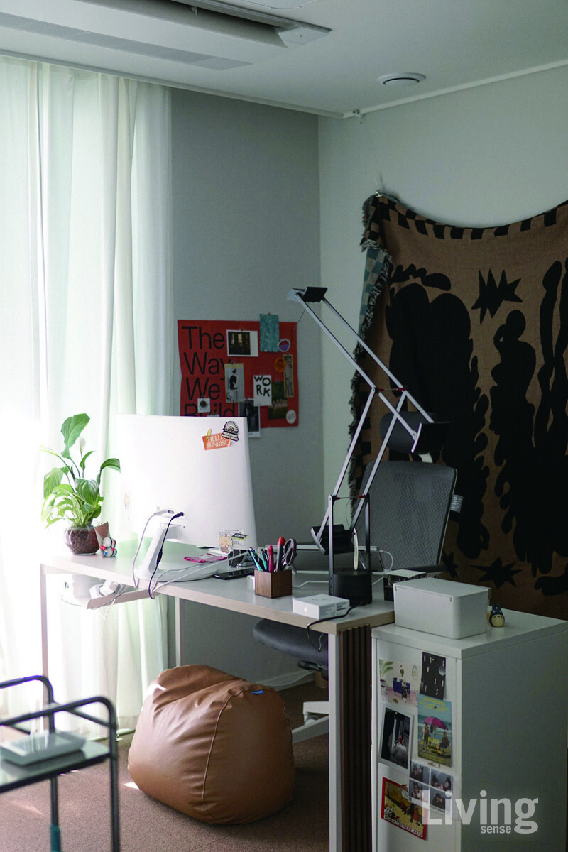 아파트로 이사하며 남은 방 하나를 작업실로 꾸몄다. 출근하는 기분이 나도록 다른 공간과는 인테리어 분위기를 달리했다. 1990년대 사무실의 모습에서 영감을 삼아, 실제로 아버지가 과거에 사용하던 컴퓨터와 시계를 들였다. 아파트 특유의 분위기를 벗기기 위해 벽지를 걷어내고, 시멘트 벽 위에 직접 페인트칠을 했다. 바닥은 업소용 데코 타일로 마감해 사무실 분위기를 완성했다. 라디에이터와 탁상 조명, 벽걸이 시계는 모두 아버지의 사무실에서 실제 사용했던 제품. 서랍, 펜꽂이 등 작은 물건까지도 그 시대의 무드를 기준으로 삼아 골랐다.