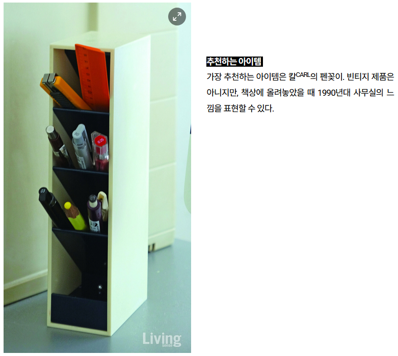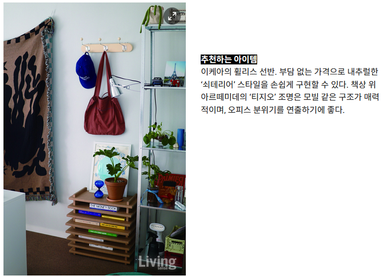 홈 오피스 인테리어의 시작은 좋아하는 소품들을 가까이에 두는 것이다. 마음에 드는 소품을 시간을 들여 하나씩 적정한 곳에 배치하다 보면, 물건이 제자리를 찾아가며 무드가 완성된다. 맥시멀리스트라면 언제나 수납과 정리가 고민일 터. 이동식 수납장을 사용하면 물건을 간편하게 옮기고 정리할 수 있어, 업무로 복잡한 공간에 여유를 더할 수 있다. 잡지 속 인테리어나 인스타그램 이미지를 참고하는 것도 좋다. 무엇보다 중요한 것은, 자신의 취향에 대한 자신감을 잃지 않는 것이다.