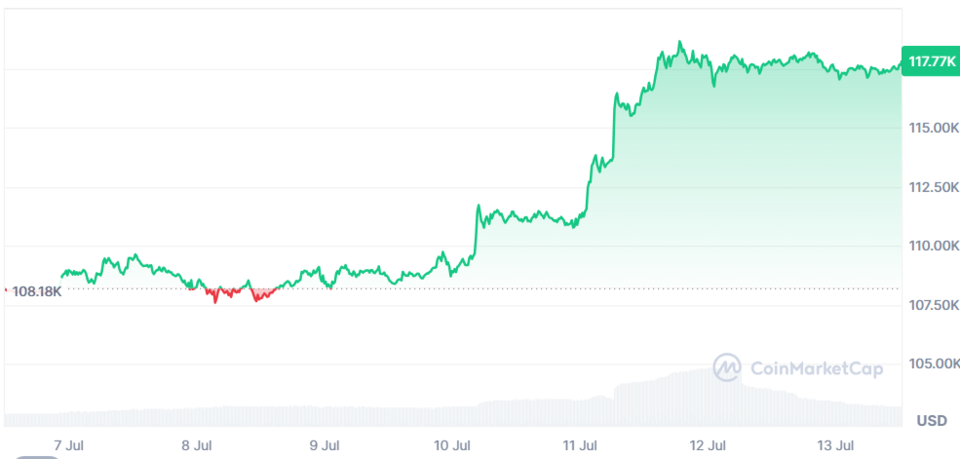 13일 글로벌 가상자산 시황 사이트 코인마켓캡에 따르면 이날 오전 8시 55분 비트코인은 11만7464달러(1억6204만원)로 일주일 전과 비교해 8.5% 급등했다. 지난 주말 10만8000달러선을 기록하던 비트코인은 10일 11만달러선을 넘기더니 11일 오후 11만8781달러까지 치솟았다. 이후 소폭 하락하면서 현재 11만7000달러선에서 거래되고 있다.