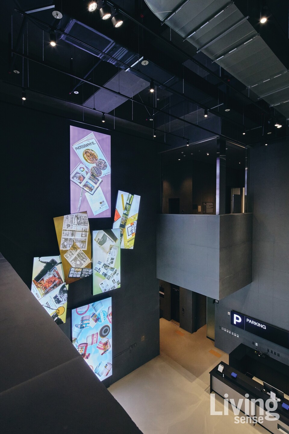 건물 외피의 밀어내고 들어가는 비정형적 형태는 건물 내부에도 반영되었다. 이 구조는 철판을 휘어 만든 거푸집 안에 콘크리트를 직접 부어서 구현한 것으로, 1층 로비와 2층 전시장 벽면 곳곳에도 왜곡된 윤곽이 그대로 드러나며 건물 외부와 내부가 같은 결로 이어진다. 외관에서 느껴지는 질감과 색감이 실내에서도 자연스럽게 연결되도록 비슷한 색으로 마감했다. 동시대 사진작가들의 다채로운 시선을 보여주는 전시 〈스토리지 스토리〉에서는, 이렇게 굴곡진 벽면을 적극적으로 활용해 작품을 설치했다. 서동신 작가는 구부러진 벽면 위에 사진 작업을 설치했고, 원성원 작가와 권지연 조경가는 전시 공간 안에 생긴 언덕을 활용해 숲의 풍경을 선보였다.