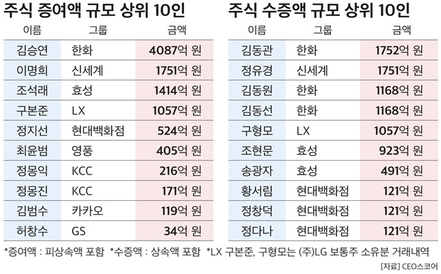 증여와 함께 오너일가의 직접 지분 매수도 활발히 이뤄졌다. CEO스코어에 따르면 1년간 개인 자금으로 가장 많은 주식을 매수한 인물은 정용진 신세계그룹 회장이다. 정 회장은 이명희 총괄회장이 보유하고 있던 ㈜이마트 주식 전량 278만7582주(지분율 10.0%)를 사재로 매입했다. 이마트에서의 지분율은 기존 18.6%에서 28.8%로 10.2%포인트 늘었다.