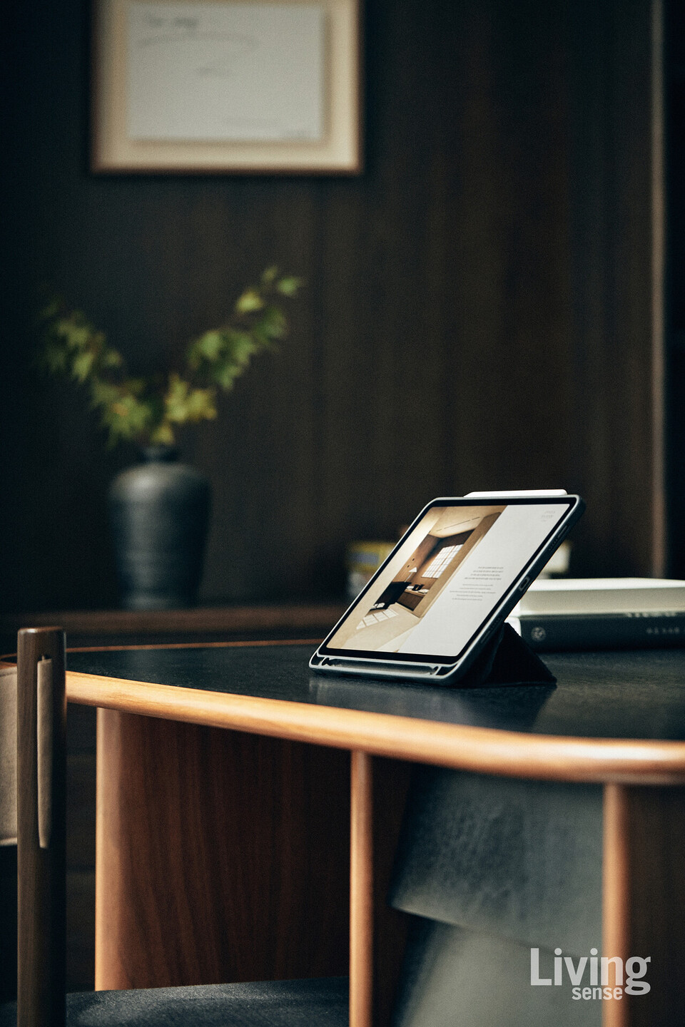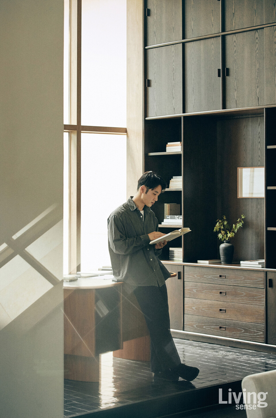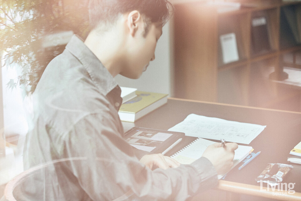 프로젝트가 쌓일수록 그의 책상은 오히려 점점 더 간소해진다. 무언가를 이뤄내기 위해 그는 더 비우고, 더 고요해지는 삶을 택했다. 직접 디자인한 책상 또한 그런 태도의 연장선에 있다. 처음부터 염두에 둔 건, 꼭 필요한 것만을 담는 최소한의 공간과 수납. 조선시대 선비들이 과거를 준비하며 간결한 서안을 썼던 이유를 이제는 이해할 수 있다고 말한다. 형태에 오직 기능만이 남은 자리, 그가 지향하는 삶과 닮았다. 그래서인지 책상 위 풍경도 단출하다. 수첩과 아이패드, 몇 자루의 펜, 그리고 늘 곁에 두는 염주 한 줄이 전부다.