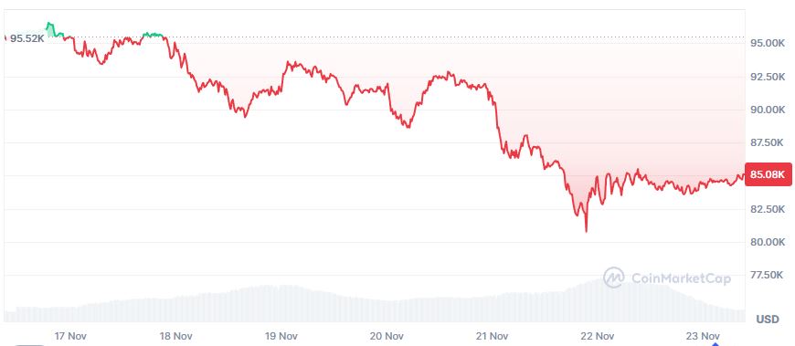 23일 글로벌 가상자산 시황 플랫폼 코인마켓캡에 따르면 이날 오전 8시 43분 비트코인은 8만4721달러(약 1억2171만원)로 일주일 전과 비교해 11.32% 크게 하락했다. 지난주말 9만5000달러선에서 거래되던 비트코인은 17일부터 우하향하더니 22일 오후 8만1002달러까지 내려갔다. 이후 시세가 소폭 상승하면서 현재 8만4700달러선에서 거래되고 있다.