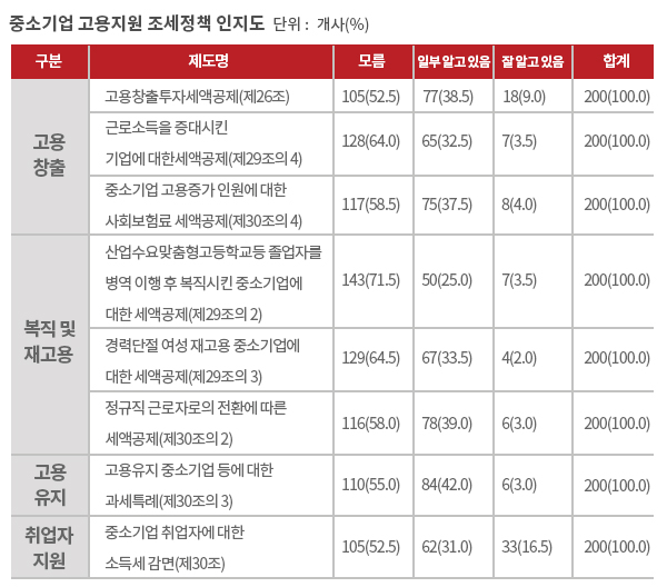 중소기업연구원이 13일 발표한 ‘조세지원을 통한 중소기업 고용 활성화 방안’에 따르면 중소기업 200개사를 대상으로 지난 6월 17일부터 2주에 걸쳐 현재 시행 중인 고용 관련 8개 세제지원책의 인지도를 조사한 결과, 응답 기업의 50% 이상이 해당 정책들에 대해 잘 모른다고 대답했다.22일 기획재정부에 따르면 정부는 다음달 초 발표될 세제개편안에 청년 상시근로자를 고용하는 기업에게 혜택을 주는 ‘청년고용 증대세제’를 담을 예정이다. 이 제도는 기업의 청년 상시근로자가 전년보다 증가하면 1명당 일정금액을 법인세에서 공제해주는 방안이다.