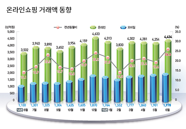 3일 통계청이 발표한 ‘6월 소매판매 및 온라인쇼핑 동향’에 따르면 6월 전체 소매판매액는 29조3450억원으로 지난해 같은 달에 비해 0.6% 감소한 반면 온라인쇼핑 거래액은 26.6% 늘어난 4조4340억원이었다.중동호흡기증후군(MERS·메르스) 등 영향으로 6월 전체 소매 판매액은 줄었지만 온라인쇼핑 판매액은 늘어난 것으로 나타났다. 모바일을 이용한 온라인쇼핑은 2조원에 육박했다.