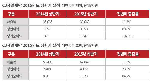 4일 CJ제일제당에 따르면 올해 상반기 매출(대한통운 제외)은 3조9663억 원으로 전년 대비 11.3% 증가했다. 영업이익은 3353억 원으로 전년 대비 80.6% 늘었다.