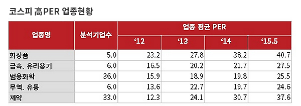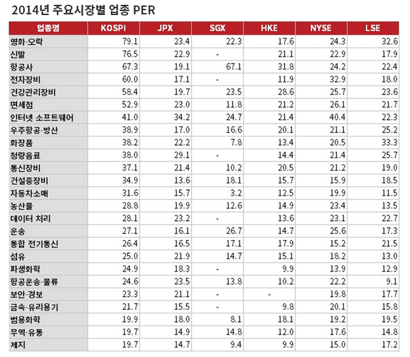한국거래소 관계자는 “2014년말 기준 코스피 평균 주가수익비율은 15.32배로 해외 증시에 비해 저평가됐다”며 “PER이 높은 25개 업종은 상대적으로 높이 평가받았다는 뜻이다”고 밝혔다.