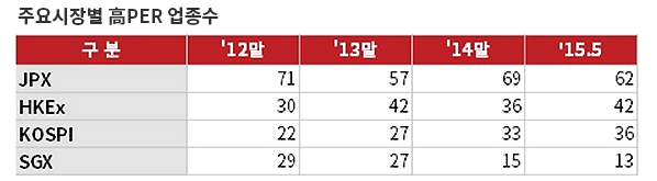 한편 이번 조사에서 거래소는 극한치 오류를 방지하기 위해 PER이 100배가 넘는 기업은 제외했다. 또 주된 영업할동 이외의 요인으로 주가가 과도하게 상승한 업종은 제외했다.일본, 홍콩, 싱가폴 등 아시아 증시와 비교해 코스피가 가장 높은 PER을 기록한 업종은 2015년 36개다. 2012년 22개, 2013년 27개, 2014년에는 33개로 꾸준히 늘고 있다.