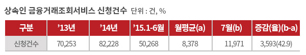 지난달 상속인 금융거래 조회서비스 이용건수가 1만건을 넘어섰다. 올 상반기 대비 크게 증가했다.