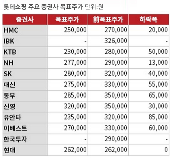 이날 가장 8.5% 급락한 롯데쇼핑의 12개 증권사 평균 목표주가는 26만8400원이다. 직전 목표주가 대비 평균 4만8100원 내렸다.