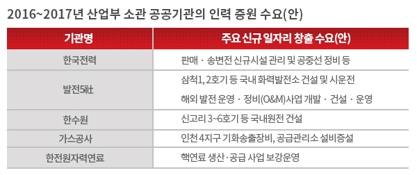 정원을 확보하지 못하는 부분은 업무위탁을 통해 협력업체의 일자리로 전환할 계획이다. 산업부는 한국전력공사의 청년고용 디딤돌 프로젝트 등과 연계해 나간다는 방침이다. 청년고용 디딤돌 프로젝트는 1개월 직무교육과 3개월 협력업체 인턴십을 거치면 협력업체에 취업할 길을 열어주는 프로그램이다.