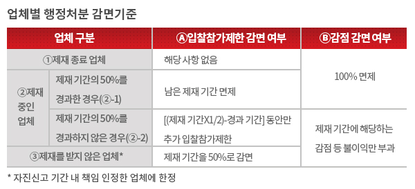 △제재 종료 후 감점을 받고 있는 업체 △제재 중에 있는 업체 △소송 중이라 제재착수를 받지 않는 업체 등은 형평성을 고려해 입찰 참가제한 기간과 감점의 감면 범위를 차등적용 받는다.