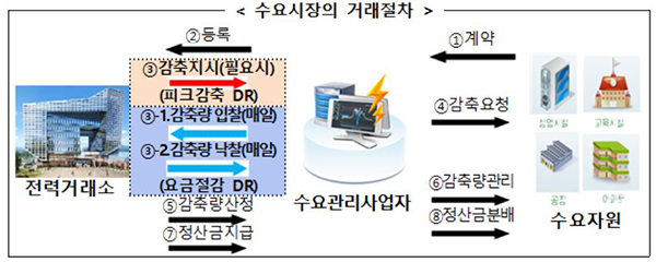 수요시장이란 공장, 빌딩, 아파트 등 전기 소비자가 절약한 전기를 수요관리사업자를 통해 전력시장에 판매하는 것이다. 전기사용자는 일상 속에서 전기를 아낀 만큼 전력시장에 판매하고 금전으로 보상을 받는다.