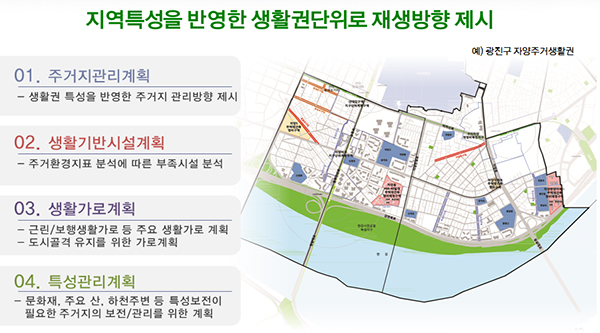 기본계획에 따르면 주거지 재생의 3대 정책비전은 ▲미래 삶의 가치가 증대되는 주거지 ▲사람과 장소 중심의 배려가 있는 주거지 ▲과정과 참여 중심의 함께 만들어 가는 주거지 등이다.