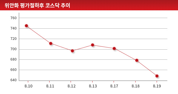 위안화 평가절하 이후 코스닥 지수는 주요 국가 증시 중 가장 심한 하락세를 보인 것으로 나타났다. 중국 중앙은행인 런민은행이 위안화를 평가절하하기 전날인 지난 10일 코스닥 지수는 746.34에 거래를 마쳤다. 11일부터 코스닥은 6 거래일간 10.15% 하락했다.