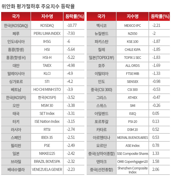 한국 증시가 이 국가 중에서 가장 많이 빠졌다. 유일하게 두자리수 하락률을 보였다. 페루LIMA 지수는 7.93%, 대만 TAIEX 지수는 4.98%, 싱가포르 STI는 4.2%, 칠레 IGPA는 1.86% 하락했다.