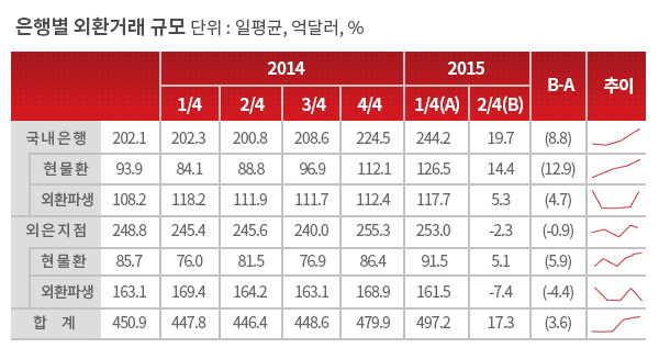 2분기 국내 은행의 외환거래량이 8.8% 증가했다. 특히 현물환 거래가 12.9% 늘면서 외환파생상품 거래액을 추월했다.