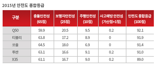 안전도 평가 결과 1등급 기준점수인 86.1점을 5개 차종이 모두 넘겼다. 최고점은 인피니티 Q50가 기록한 92.1점이다. 쌍용 티볼리(91.9점), 기아차 쏘울EV(91.4점), 현대차 투싼(91.0점), BMW X3(89.0점)가 뒤를 이었다.
