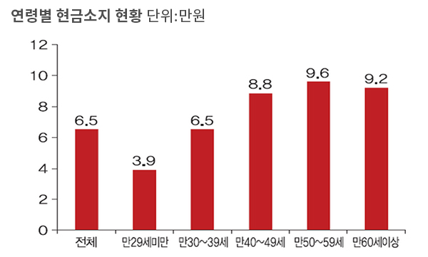 한국은행이 2010년 조사한 바에 따르면 연령이 높을수록 현금을 더 많이 소지하는 것으로 나타났다. 1인당 현금 보유 규모는 20대와 30대가 각각 3.9만원 6.5만원인데 반해 40대는 8.8만원, 50대는 9.6만원이다.