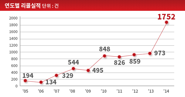 공정거래위원회는 25일 리콜 관련 소비자 피해를 예방하기 위해 각 정부부처 및 지자체, 소비자원의 2014년도 리콜 실적을 분석해 발표했다. 지난해 리콜건수는 1752건으로 2013년 실적(973건) 대비 779건이 증가(80%)해 증가폭이 사상 최대치를 보였다.