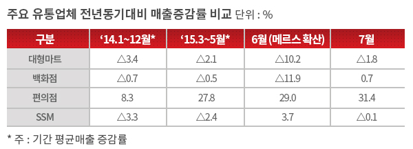 메르스 영향은 6월에 대형마트와 백화점을 중심으로 크게 나타났으나 편의점과 SSM은 큰 영향을 받지 않았다고 산업부는 밝혔다.