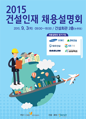 대한건설협회(회장 최삼규)는 다음달 3일 서울 논현동 건설회관에서 2015 건설인재 채용설명회를 개최한다고 26일 밝혔다.