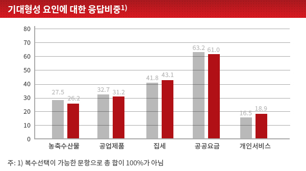 개인서비스 값이 물가를 높인다고 응답한 비율은 18.9%이었다. 지난달보다 2.4%P 올랐다. 공업제품은 31.2%로 지난달보다 1.5%P 줄었다.