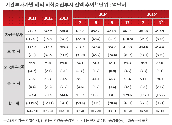 한국은행은 27일 6월말 기관투자가 외화증권투자 잔액이 1153억 달러에 달한다고 발표했다. 이는 지난 연말에 비해 173.6억 달러, 20013년 말에 비해선 408.6억 달러나 늘어난 것이다.