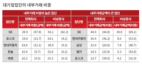 공정거래위원회는 27일 ‘대기업집단 내부거래 현황’에서 SK의 내부거래 비중이 29%로 가장 높았다고 밝혔다. 지난해 15.6%였던 것이 크게 증가했다. 포스코(19.4%)와 현대자동차(18.8%) 그룹이 뒤를 이었다.
