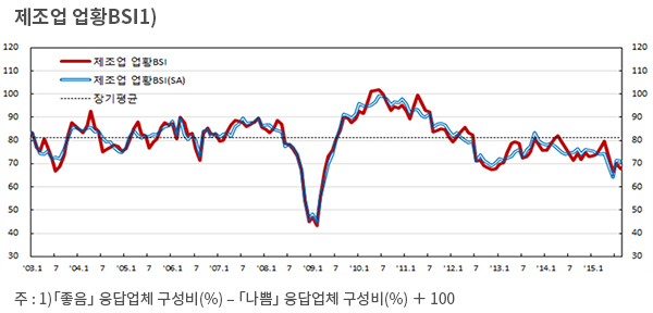 메르스 사태 때문에 6월에 66까지 급락했던 제조업 BSI는 7월 들어 70으로 회복됐으나 8월엔 다시 소폭 하락했다. 그 중에서도 수출기업과 대기업에서 전달보다 상황이 좋지 않았다는 응답이 늘었다.