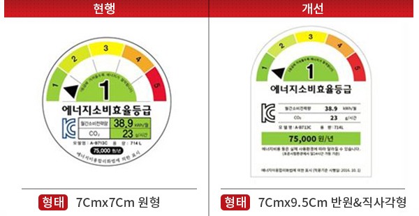 효율등급 라벨은 크기가 확대되고 에너지비용 산출근거를 명시하게 된다. 라벨 크기는 기존 7㎝×7㎝에서 7㎝×9.5㎝로 확대된다. 형태는 '원형'에서 '반원+직사각형태'로 변경된다.