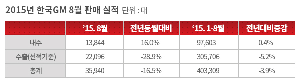 1일 한국GM은 8월 내수 1만3844대, 수출 2만2096대 등 총 3만5940대를 팔았다고 밝혔다. 내수 시장 선전이 돋보인다. 지난해 동기 대비 16% 늘었다. 신형 스파크를 비롯한 전 차종 판매가 뛰었다.