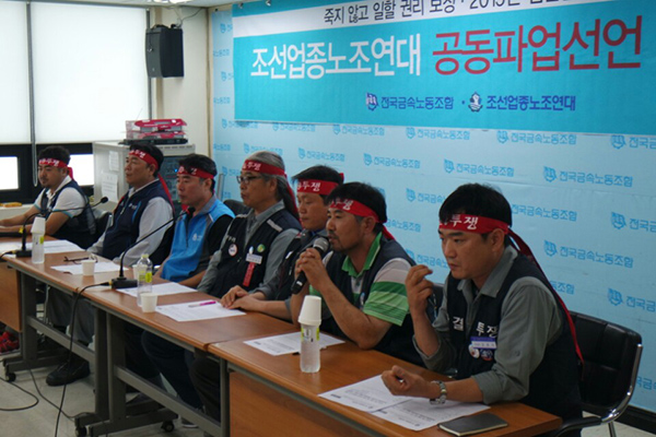 조선업종 노조연대는 2일 서울 중구 금속노조 회의실에서 열린 기자회견을 통해 오는 9일 공동파업에 돌입한다고 밝혔다. 회견에는 정명모 현대중공업노조 위원장, 홍지욱 금속노조 부위원장 및 대우조선해양, 한진중공업, 현대미포조선 노조 대표 등이 참석했다.