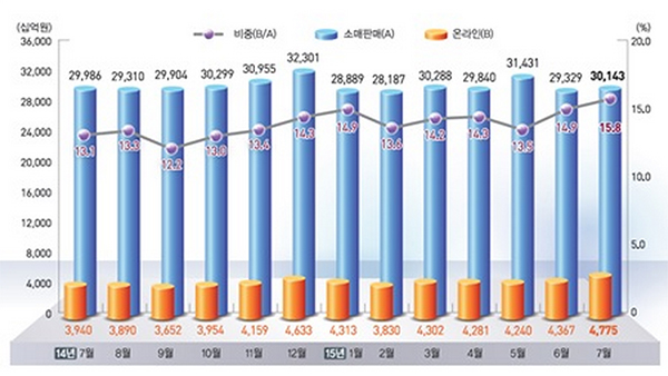 통계청이 2일 발표한 ‘소매판매 및 온라인쇼핑 동향’에 따르면 지난 7월 전체 소매판매액은 30조1430억원으로 지난해 같은 기간보다 0.5%(29조9860억원) 증가했다. 소매판매에서 온라인쇼핑 거래액 비중은 15.8%(4조7750억원)로 사상 최고치를 기록했다.
