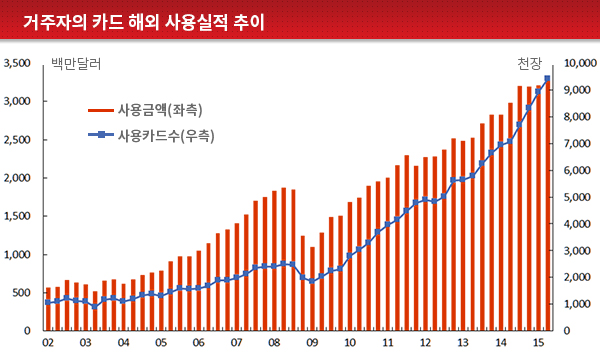 메르스에도 불구하고 여행객의 신용카드 결제액은 늘었다. 발급장수가 총액보다 더 빠르게 늘면서 신용카드 결제액 소액화 경향이 엿보인다.