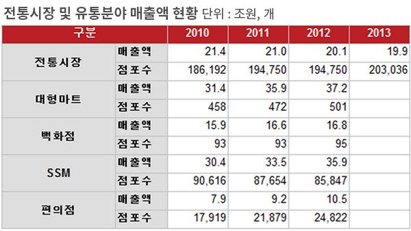 대형마트의 매출액은 오히려 증가해 대형마트와 전통시장 매출액 격차는 2010년 4.4배에서 2012년 5배로 커졌다. 대형마트 매출액은 2010년 31조4000억원에서 2011년 35조9000억원, 2012년 37조2000억원으로 크게 늘었다. 백화점 매출도 2010년 15조9000억원에서 2012년 16조8000억원으로 늘었다. 같은기간 기업형 슈퍼마켓(SSM)과 편의점의 매출액도 약 30%씩 증가했다.