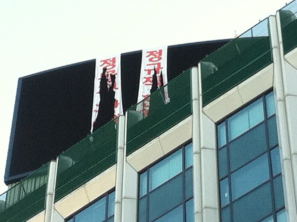 7일 기아차 고공농성 경기대책위에 따르면 서울광장 옆 인권위 건물 옥상 광고탑에서 농성 중인 최정명(45)씨와 한규협(41)씨가 설치한 현수막이 새벽 사이 훼손된 채 발견됐다.
