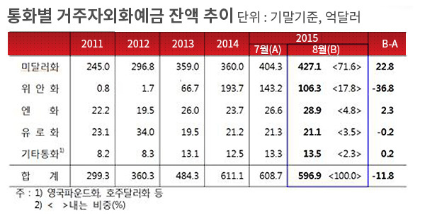국내 외화예금 잔액은 596억9000만달러로 한달 전보다 11억8000만 달러 감소했다. 위안화 절하로 차익거래 유인이 줄면서 위안화 예금이 빠져나간 탓이다. 달러화예금은 수출입기업 대금 유치로 늘었다.