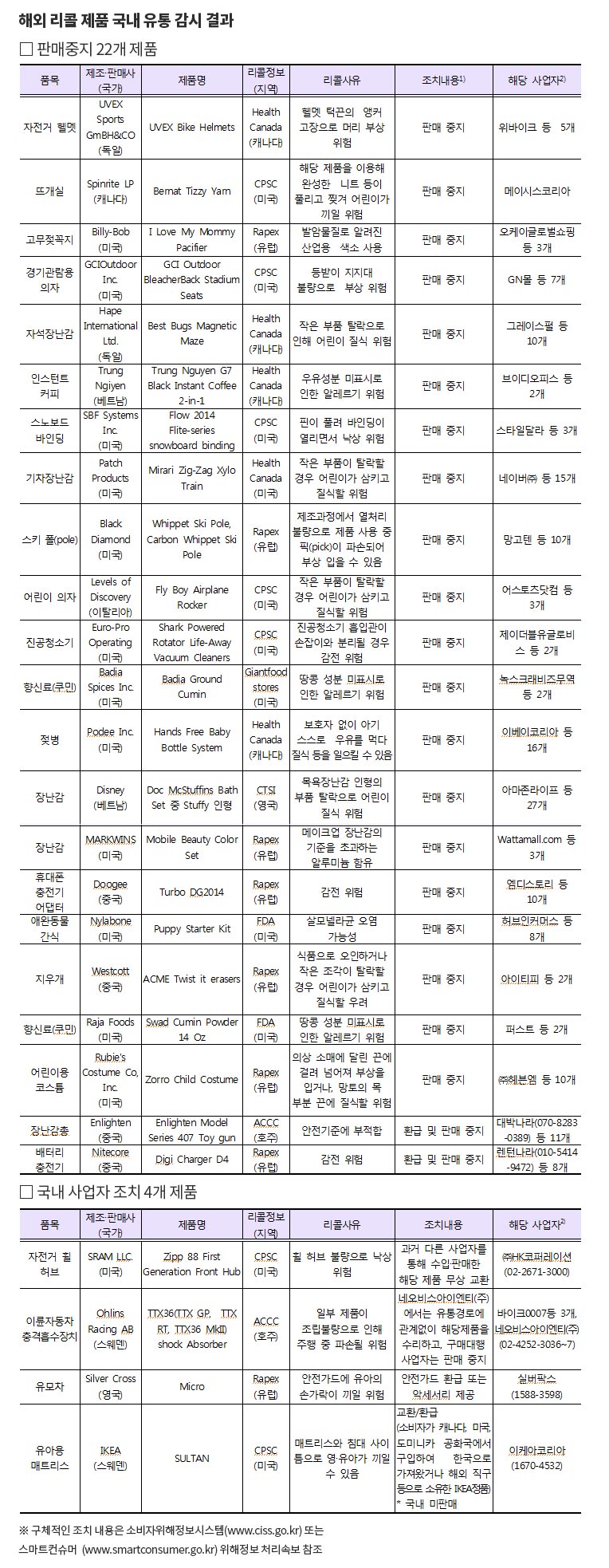 한국소비자원, 해외 리콜 26개 제품 판매 중지