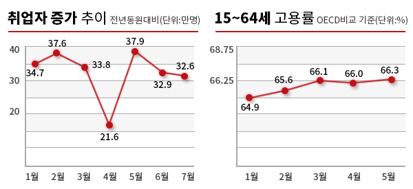 4월 20만 명대로 주저앉았던 취업자 증가폭은 5월 37만9000명을 기록한 뒤 3개월 연속 30만명이 넘었다.