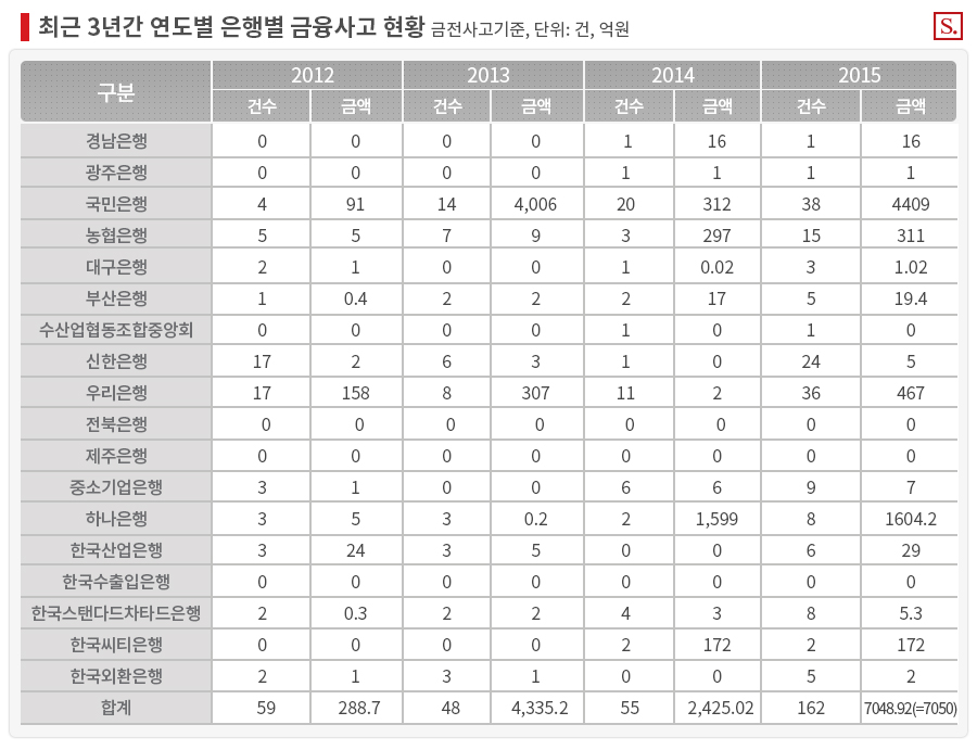9일 국회 정무위원회 소속 오신환 새누리당 의원이 금융감독원(원장 진웅섭)으로부터 제출받은 은행별 금융사고 현황 자료에 따르면 지난 2012년부터 지난해까지 은행권에서 발생한 금융사고 건수와 피해액은 162건, 7050억원이다.
