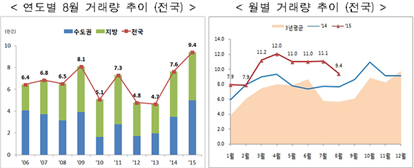 한편, 주택 유형별 8월 거래량 증가율(전년동월 대비)은 전세난 여파로 인해 값이 싼 연립·다세대가 48.3%로 가장 높았다. 단독·다가구, 아파트는 각각 37.1%, 15.1%씩 증가했다.