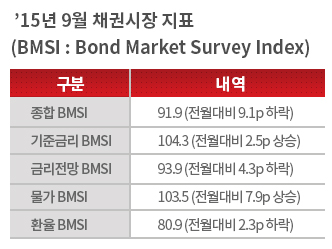 종합BMSI는 0부터 200까지다. 지표는 100을 기준으로 그 이상이면 채권시장이 전반적으로 호전됐음을 뜻한다. 9월 종합 BMSI가 100 이하고, 전월 대비 하락한 것은 채권시장 심리가 전월 대비 악화됐음을 뜻한다.