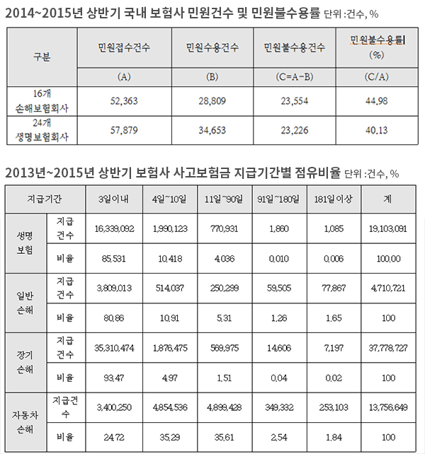 생명보험사와 손해보험사는 고객의 민원 해결에 소홀한 것으로 드러났다. 금융감독원이 제출한 「2014년~15년 상반기 국내 보험사 민원 접수 및 민원 불수용률」자료를 분석한 결과, 손해보험사는 민원 5만2363건을 접수했지만 이 중 2만3554건은 수용되지 않았다. 전체 44.98%에 해당하는 수준이다. 생명보험사는 민원 5만7879건 중 40.13%에 해당하는 2만3226건을 수용하지 않았다.